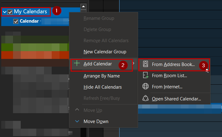 To add someone’s calendar to your outlook, right-click “My Calendars” > “Add Calendar” > “From Address Book...”