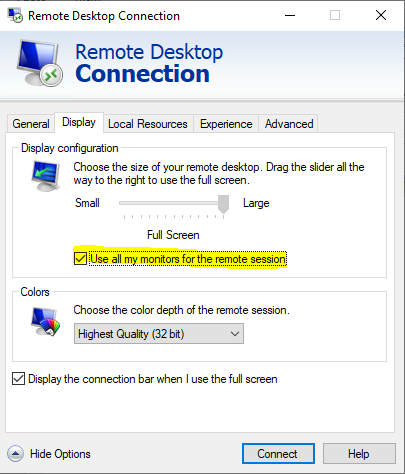 - Make sure to check/uncheck on "Use all my monitors for the remote session" RDP for users using Terminal Services.