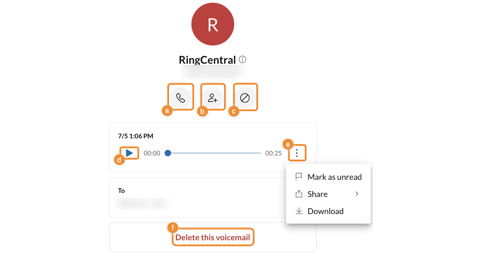 Delete: Delete the voicemail. Click Delete in the popup to confirm. (f)