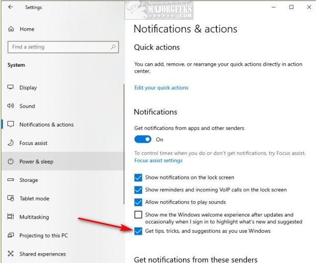 How to disable tips, tricks, and suggestions from Windows, Outlook, Word, Excel, PowerPoint Anya Grossman September 25, 2023 19:13 Click on Start (the Windows Icon) Type and then select "Settings." Click "System" Click "Notifications & Actions" Uncheck the box for "Get tips, tricks, and suggestions as you use Windows." Comments 0 comments Please sign in to leave a comment.